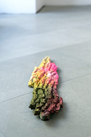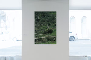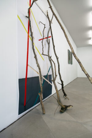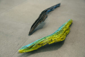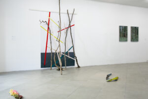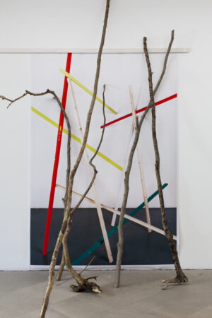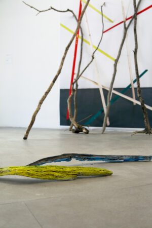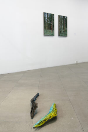 Gleichzeitig habe ich auch einige der Waldelemente, wie ich sie nenne „Waldobjekte“, aus dem Wald mitgebracht. Sie werden im Ausstellungsraum installativ eingesetzt.